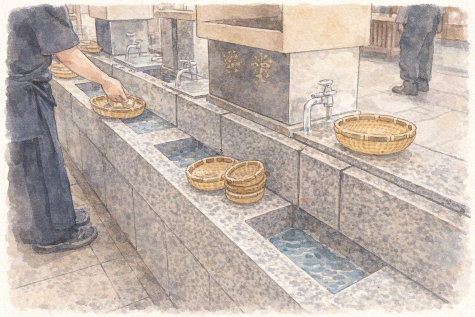 まず、境内の井戸の水でお金を洗うためのザルやバケツが用意されていますので、そこに小銭や紙幣を入れます。次に、水で優しくゆすぎながら洗います。