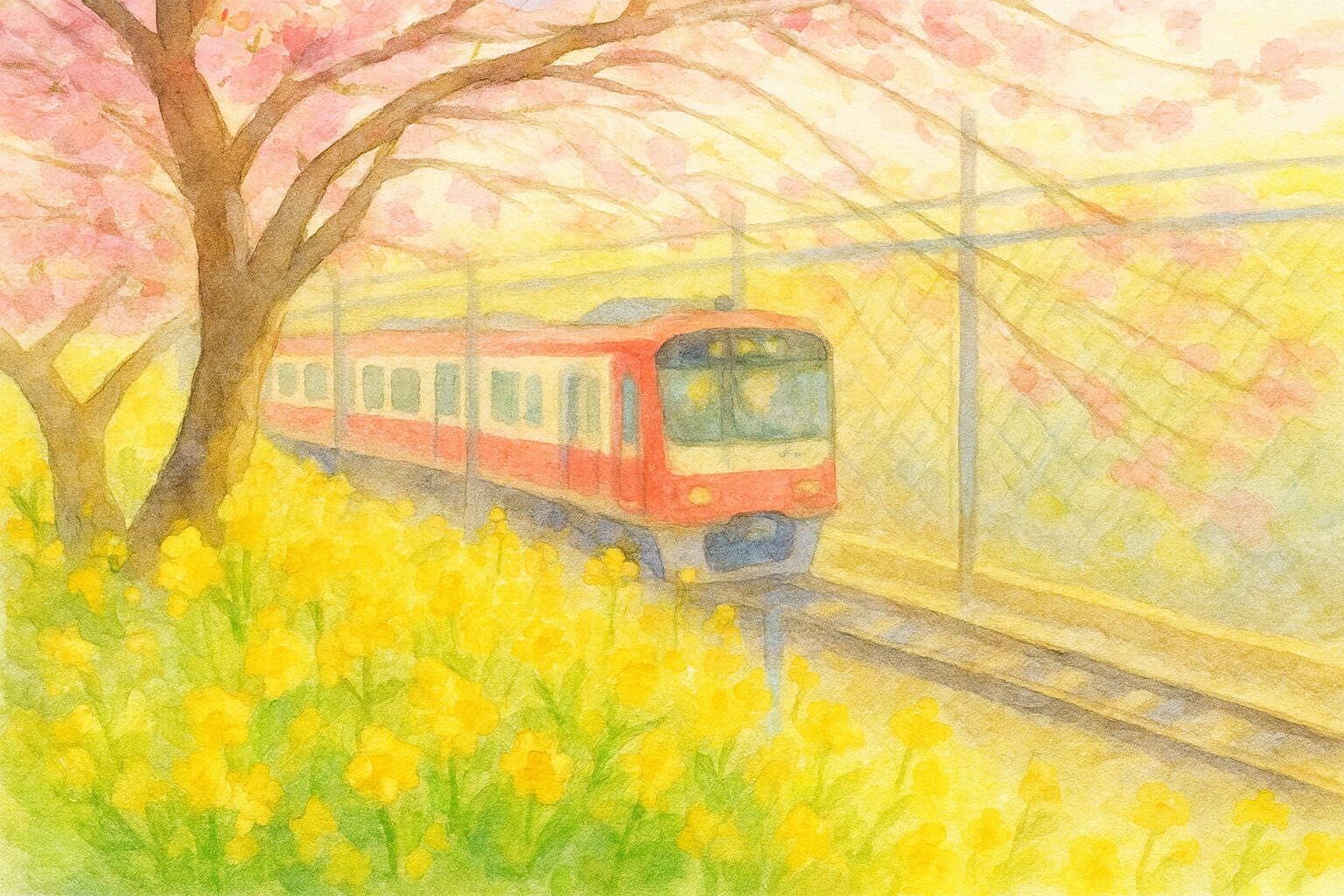 たとえば、三浦海岸駅から線路沿いを歩くと、濃いピンクの河津桜が連なり、その足元には菜の花が広がります。そこへ赤い京急電車が通過する――そのコントラストがなんとも印象的。思わず立ち止まってシャッターを切りたくなります。